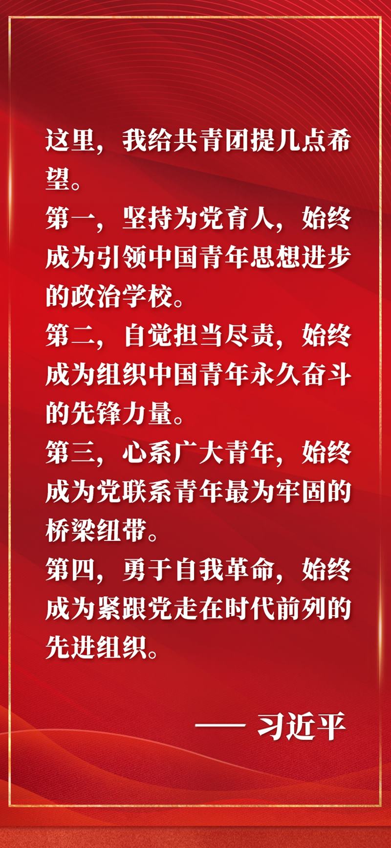 慶祝中國(guó)共產(chǎn)主義青年團(tuán)成立100周年大會(huì)10日上午在北京人民大會(huì)堂隆重舉行。中共中央總書(shū)記、國(guó)家主席、中央軍委主席習(xí)近平在會(huì)上發(fā)表重要講話,全面回顧百年來(lái)共青團(tuán)堅(jiān)定不移聽(tīng)黨話、跟黨走的奮斗歷程,深刻闡明共青團(tuán)和青年工作的寶貴經(jīng)驗(yàn),對(duì)當(dāng)代青年寄予殷切期望,對(duì)做好新時(shí)代共青團(tuán)工作提出明確要求。