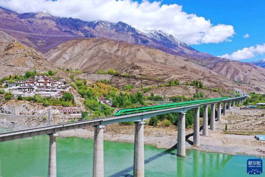 復(fù)興號列車行駛在西藏朗縣境內(nèi)(2022年4月14日攝)。新華社記者 覺果 攝