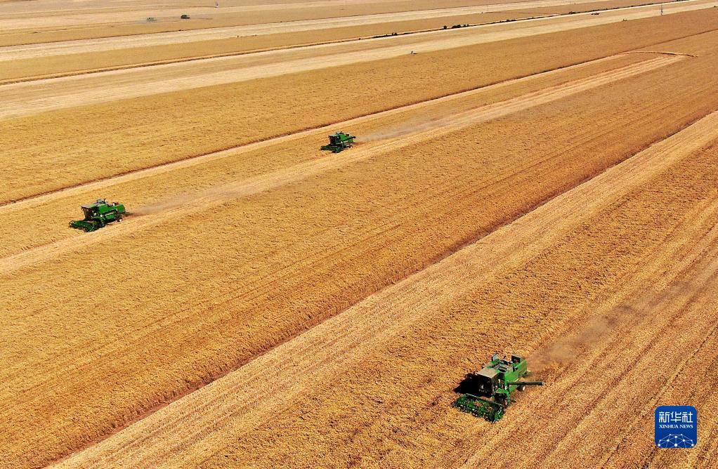 在河南省安陽市湯陰縣菜園鎮(zhèn)高標(biāo)準(zhǔn)農(nóng)田示范區(qū),收割機(jī)在麥田作業(yè)(2022年6月8日攝)。新華社記者 郝源 攝