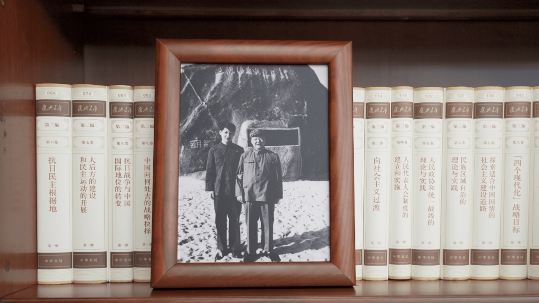 書架上擺放著一張合影。這是1999年9月30日,江澤民同志、朱镕基同志、習(xí)仲勛同志在慶祝建國五十周年招待會上。這張照片第一次出現(xiàn)在習(xí)近平總書記的書架上。
