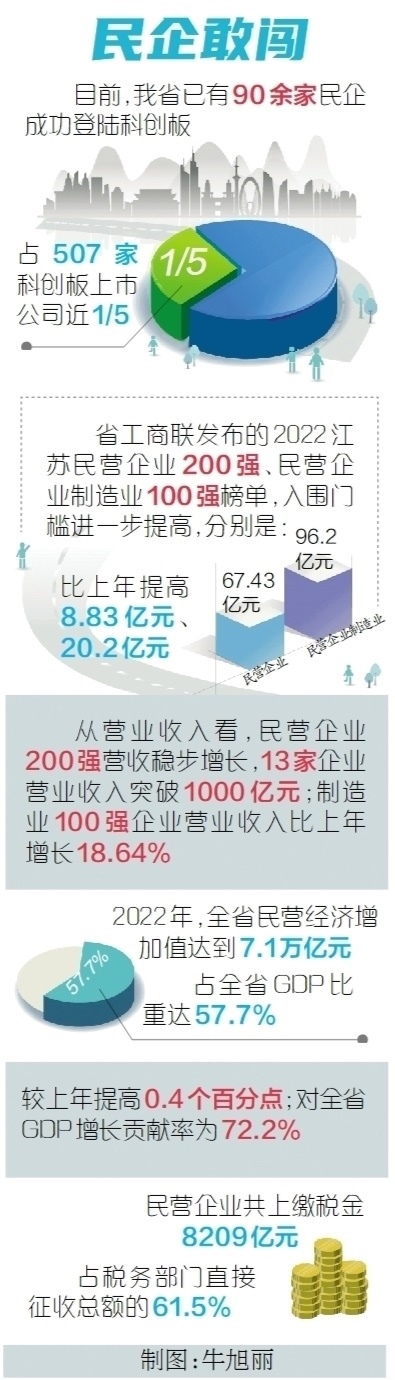 勇立實業(yè)潮頭,爭當奮楫搏浪的“水手”,另一份榜單同樣能佐證江蘇民企的勇毅前行。去年9月,省工商聯(lián)發(fā)布2022江蘇民營企業(yè)200強、民營企業(yè)制造業(yè)100強榜單,入圍門檻進一步提高,分別達67.43億元、96.2億元,比上年提高8.83億元、20.2億元。從營業(yè)收入看,民營企業(yè)200強營收穩(wěn)步增長,13家企業(yè)營業(yè)收入突破1000億元;制造業(yè)100強企業(yè)營業(yè)收入比上年增長18.64%。