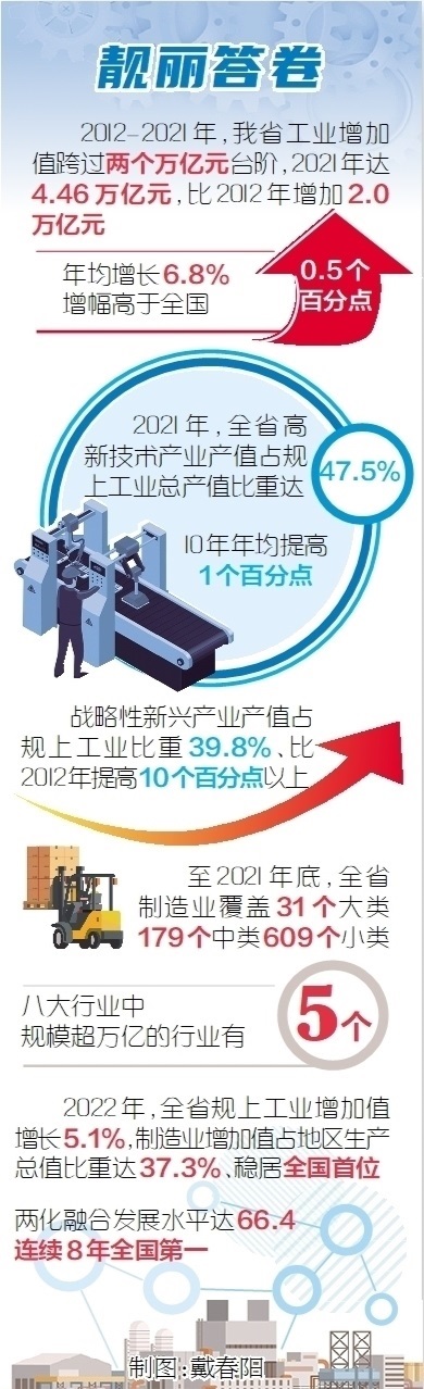 制造業(yè)規(guī)模實力保持領(lǐng)先。我省把制造業(yè)高質(zhì)量發(fā)展擺在更加突出位置,加快傳統(tǒng)產(chǎn)業(yè)轉(zhuǎn)型和戰(zhàn)略性新興產(chǎn)業(yè)發(fā)展,推進產(chǎn)業(yè)邁向中高端水平。工業(yè)增加值10年跨過3萬億、4萬億兩個臺階,2021年達4.46萬億元,比2012年增加2.0萬億元,年均增長6.8%,增幅高于全國0.5個百分點。