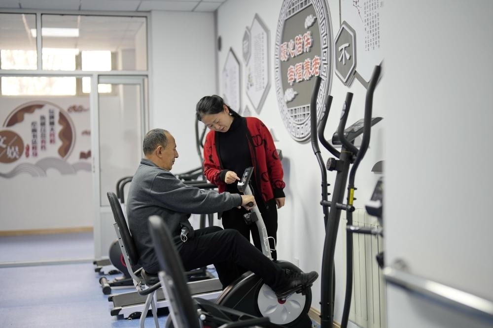 2023年4月16日,老年人在唐山市豐南區(qū)胥各莊鎮(zhèn)一處社區(qū)養(yǎng)老服務(wù)中心內(nèi)健身。新華社記者 牟宇 攝
