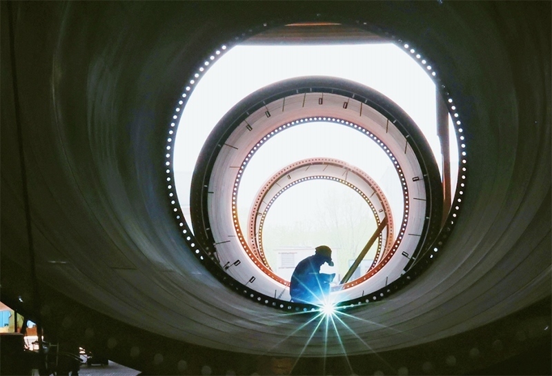 2023年一季度,我國國內(nèi)生產(chǎn)總值同比增長4.5%,國民經(jīng)濟開局良好,為實現(xiàn)全年發(fā)展目標奠定了基礎(chǔ),注入了信心。圖為2023年4月18日,工人在江蘇連云港經(jīng)濟技術(shù)開發(fā)區(qū)一家公司內(nèi)加工組裝風(fēng)電塔筒。 中新社發(fā) 耿玉和/攝
