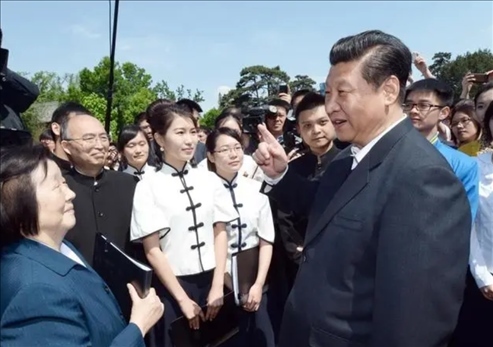 △2014年5月4日,習(xí)近平總書記在北京大學(xué)校園觀看北大師生紀(jì)念五四運(yùn)動(dòng)95周年青春詩會(huì)時(shí)同朗誦者親切交談。