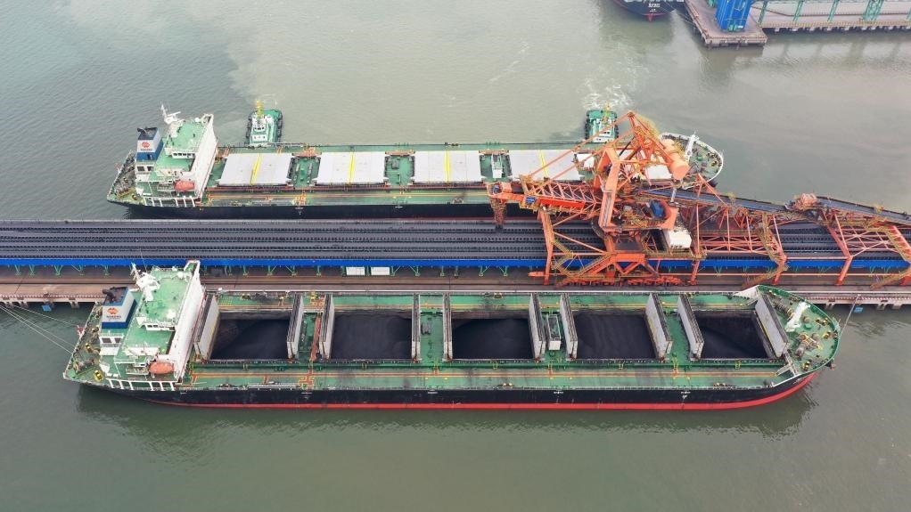 5月11日,船舶停靠在黃驊港煤炭港區(qū)碼頭(無人機(jī)照片)。新華社記者 駱學(xué)峰 攝