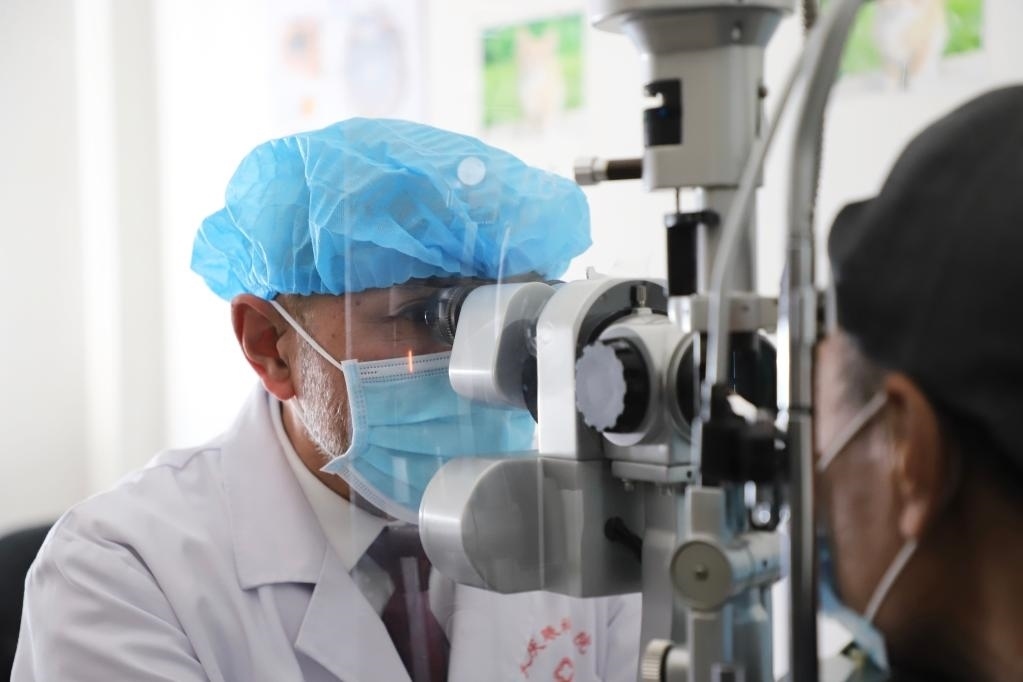 卡培拉別科夫?yàn)榛颊邫z查雙眼(2020年4月11日攝)。新華社記者 徐凱鑫 攝