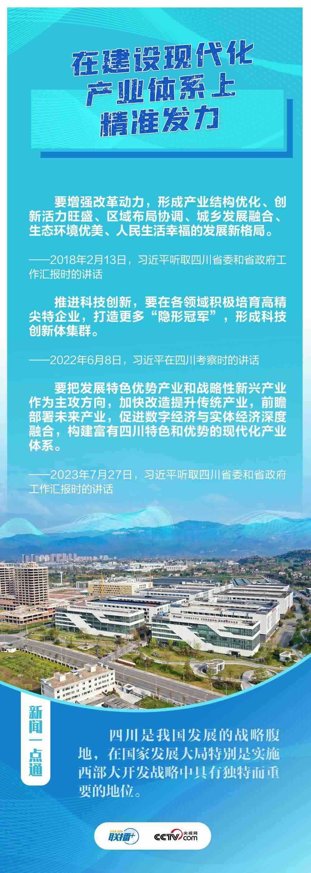 “希望四川在推進(jìn)科技創(chuàng)新和科技成果轉(zhuǎn)化上同時發(fā)力,在建設(shè)現(xiàn)代化產(chǎn)業(yè)體系上精準(zhǔn)發(fā)力,在推進(jìn)鄉(xiāng)村振興上全面發(fā)力,在筑牢長江黃河上游生態(tài)屏障上持續(xù)發(fā)力?!?月27日,在巴蜀大地考察的習(xí)近平總書記聽取四川省委和省政府工作匯報(bào),對四川各項(xiàng)工作提出新寄望。