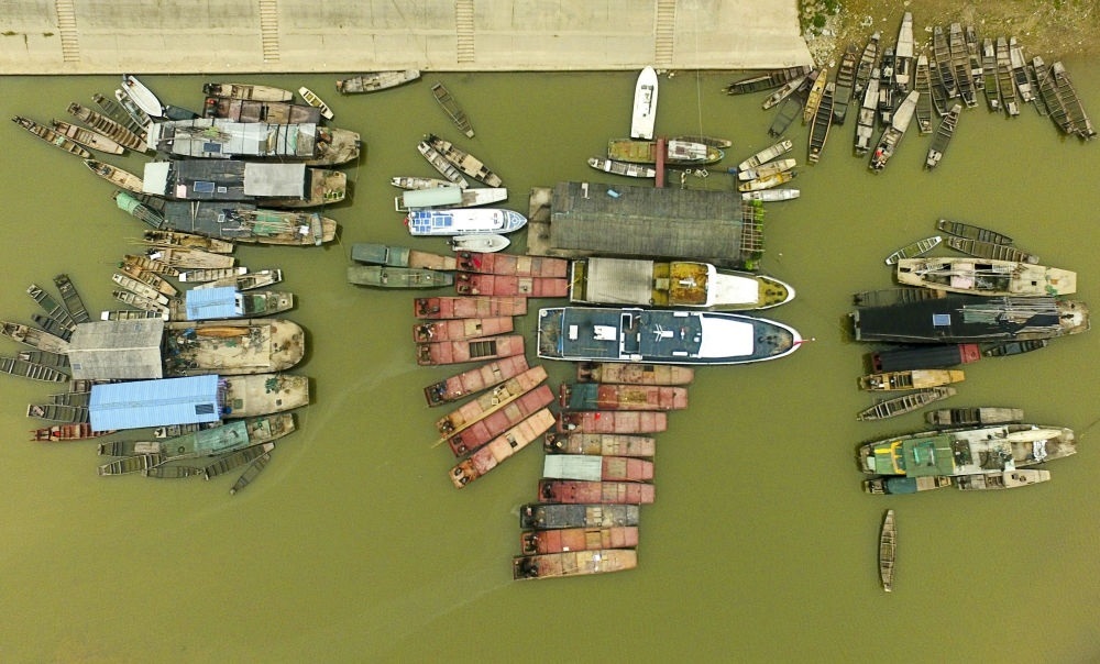 這是2019年12月17日在湖南常德漢壽縣蔣家嘴鎮(zhèn)拍攝的??吭诙赐ズ叺臐O船(無人機照片)。2020年1月1日零時起,長江流域332個自然保護區(qū)和水產(chǎn)種質(zhì)資源保護區(qū)全面禁止生產(chǎn)性捕撈。長江流域各地重點水域也相繼進入為期十年的常年禁捕期。