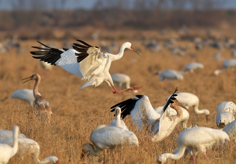 這是2021年1月15日在鄱陽湖畔的江西余干縣康山墾殖場插旗洲拍攝的白鶴。隨著長江重點水域生態(tài)修復(fù)措施的落實,鄱陽湖環(huán)境正發(fā)生嬗變。江西鄱陽湖國家級自然保護區(qū)管理局2022年新年伊始發(fā)布的鄱陽湖區(qū)最新鳥情數(shù)據(jù)顯示,工作人員在野外監(jiān)測統(tǒng)計到水鳥76.6萬余只,創(chuàng)有監(jiān)測記錄以來新高。