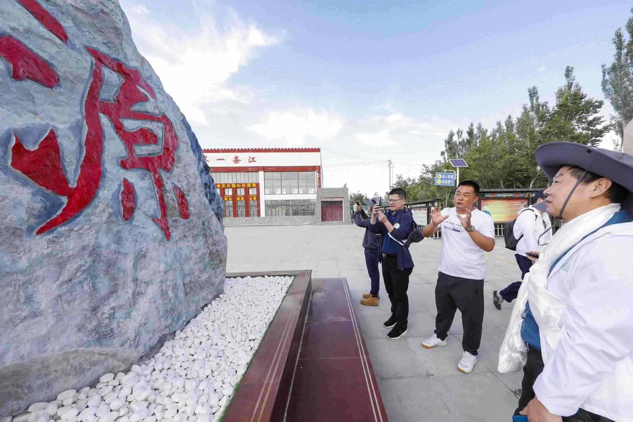 2023年7月22日,格爾木市長江源民族學(xué)校校長李軍(左三)講解該校以生態(tài)文明為特色的校園文化。王箏 攝