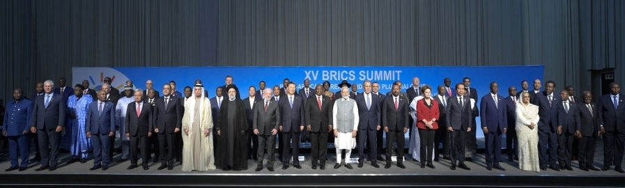當(dāng)?shù)貢r(shí)間8月23日上午,金磚國(guó)家領(lǐng)導(dǎo)人第十五次會(huì)晤在約翰內(nèi)斯堡杉藤會(huì)議中心舉行。南非總統(tǒng)拉馬福薩主持會(huì)晤。中國(guó)國(guó)家主席習(xí)近平、巴西總統(tǒng)盧拉、印度總理莫迪和俄羅斯總統(tǒng)普京(線(xiàn)上)出席。這是會(huì)晤期間,五國(guó)領(lǐng)導(dǎo)人集體合影。新華社記者 李學(xué)仁 攝