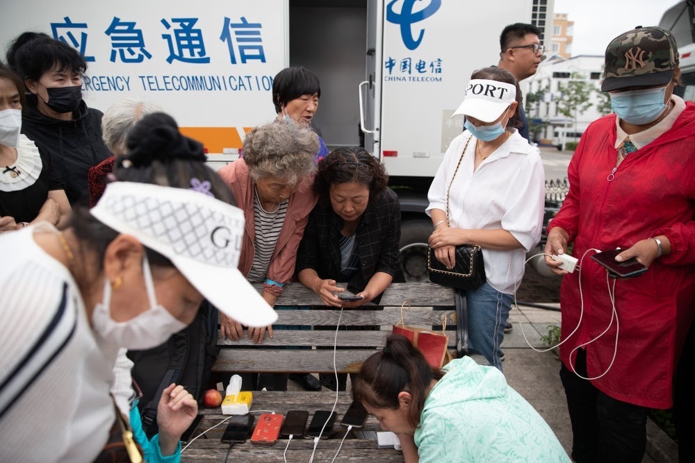 8月6日,群眾在黑龍江省海林市長汀鎮(zhèn)一廣場(chǎng)上的應(yīng)急通信車前與外界通話。