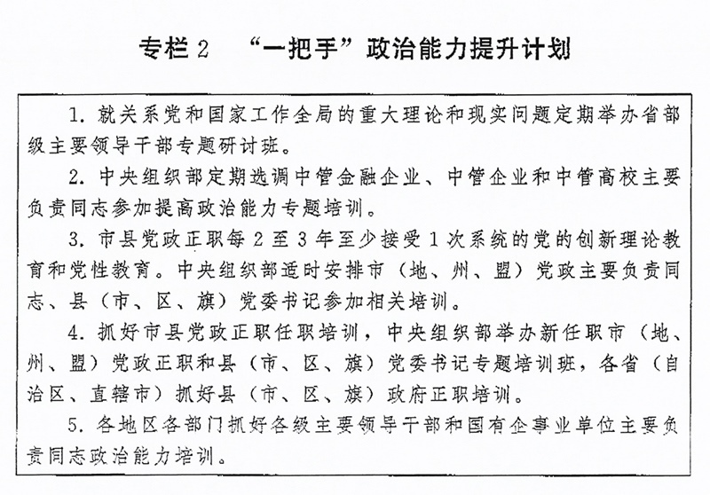(二)突出“關(guān)鍵少數(shù)”政治訓(xùn)練。堅持把政治訓(xùn)練貫穿干部成長全周期,使干部的政治素養(yǎng)、政治能力與擔(dān)負(fù)的領(lǐng)導(dǎo)職責(zé)相匹配。強(qiáng)化“一把手”政治培訓(xùn),有計劃地選調(diào)地方、部門、國有企事業(yè)單位主要負(fù)責(zé)同志到黨校(行政學(xué)院)、干部學(xué)院參加專題培訓(xùn)。實(shí)施“一把手”政治能力提升計劃(專欄2)。?。ㄗ灾螀^(qū)、直轄市)、市(地、州、盟)、縣(市、區(qū)、旗)黨政領(lǐng)導(dǎo)班子成員每2至3年到黨校(行政學(xué)院)、干部學(xué)院至少接受1次系統(tǒng)的黨的創(chuàng)新理論教育和黨性教育,5年內(nèi)累計不少于2個月。圍繞提高政治能力和領(lǐng)導(dǎo)能力,加強(qiáng)機(jī)關(guān)司局長、處長任職培訓(xùn)。重視對女干部、少數(shù)民族干部、黨外干部等的政治培訓(xùn)。加強(qiáng)對高層次人才的政治引領(lǐng),中央組織部會同有關(guān)單位每年組織一定數(shù)量人才開展國情研修。