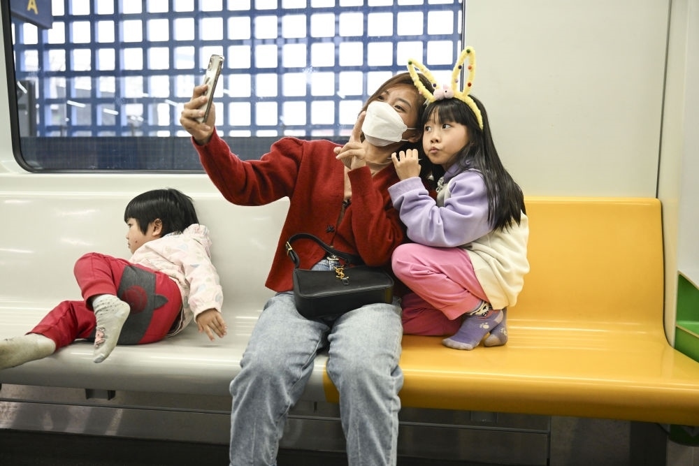 2023年12月9日,市民在越南河內(nèi)吉靈-河?xùn)|線輕軌車廂里自拍。新華社記者程一恒攝