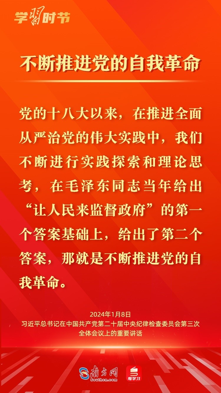 1月8日,中共中央總書記、國(guó)家主席、中央軍委主席習(xí)近平在中國(guó)共產(chǎn)黨第二十屆中央紀(jì)律檢查委員會(huì)第三次全體會(huì)議上發(fā)表重要講話,深刻闡述黨的自我革命的重要思想,對(duì)持續(xù)發(fā)力、縱深推進(jìn)反腐敗斗爭(zhēng)作出戰(zhàn)略部署。