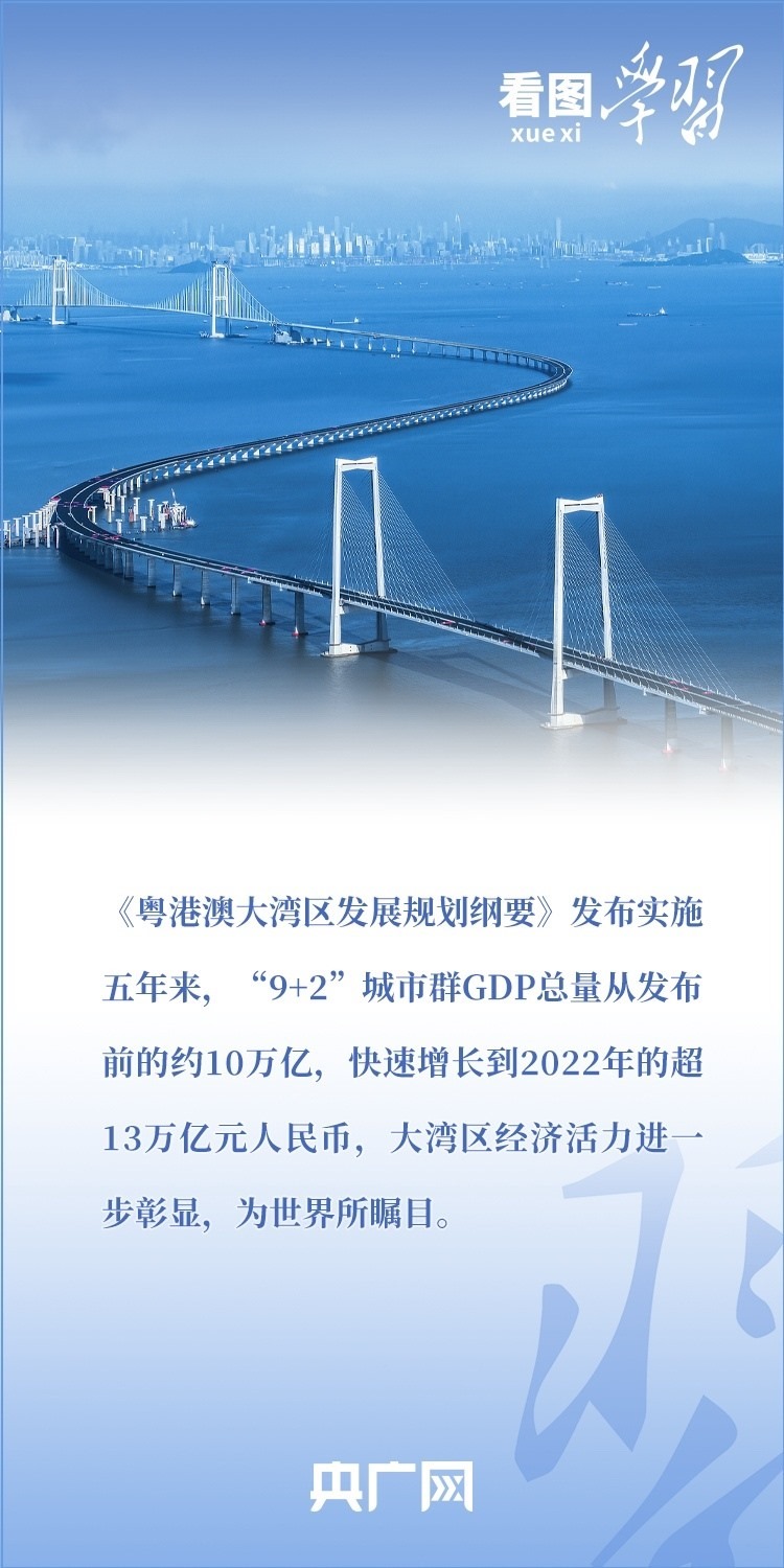 2019年2月,《粵港澳大灣區(qū)發(fā)展規(guī)劃綱要》正式發(fā)布。五年來,習(xí)近平總書記多次作出重要部署和深刻闡述,引領(lǐng)推進粵港澳大灣區(qū)高水平建設(shè)??倳洀娬{(diào),要使粵港澳大灣區(qū)成為新發(fā)展格局的戰(zhàn)略支點、高質(zhì)量發(fā)展的示范地、中國式現(xiàn)代化的引領(lǐng)地。一起來學(xué)習(xí)!