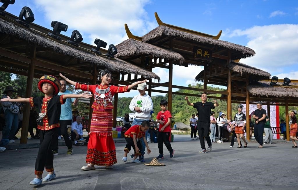 “來吧,大家一起跳起來。”隨著祈愿健康平安、風調雨順的黎族共同舞音樂響起,王麗冰和姐妹們熱情地拉著大家共舞起來,現(xiàn)場一片歡聲笑語。