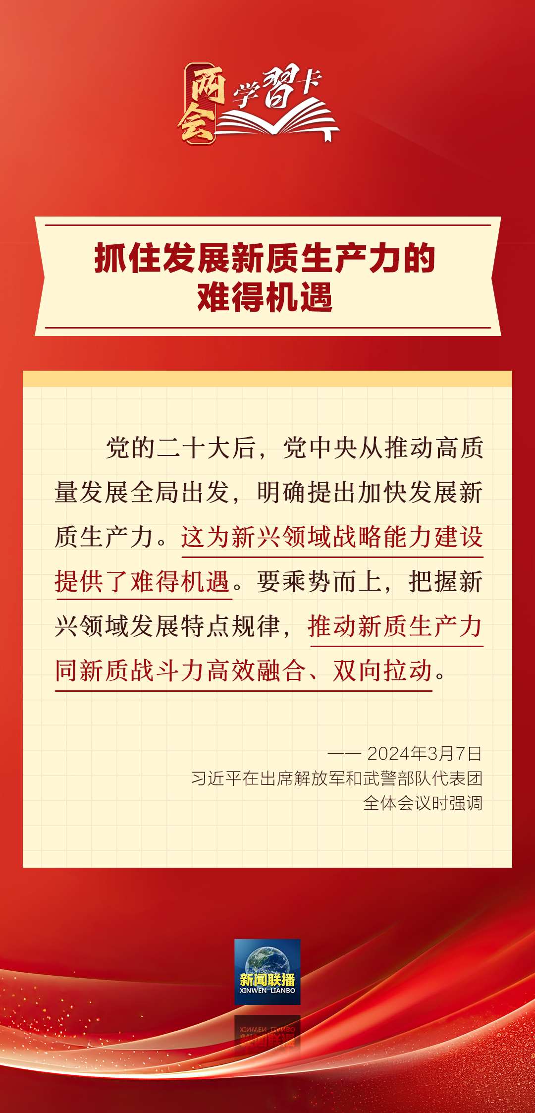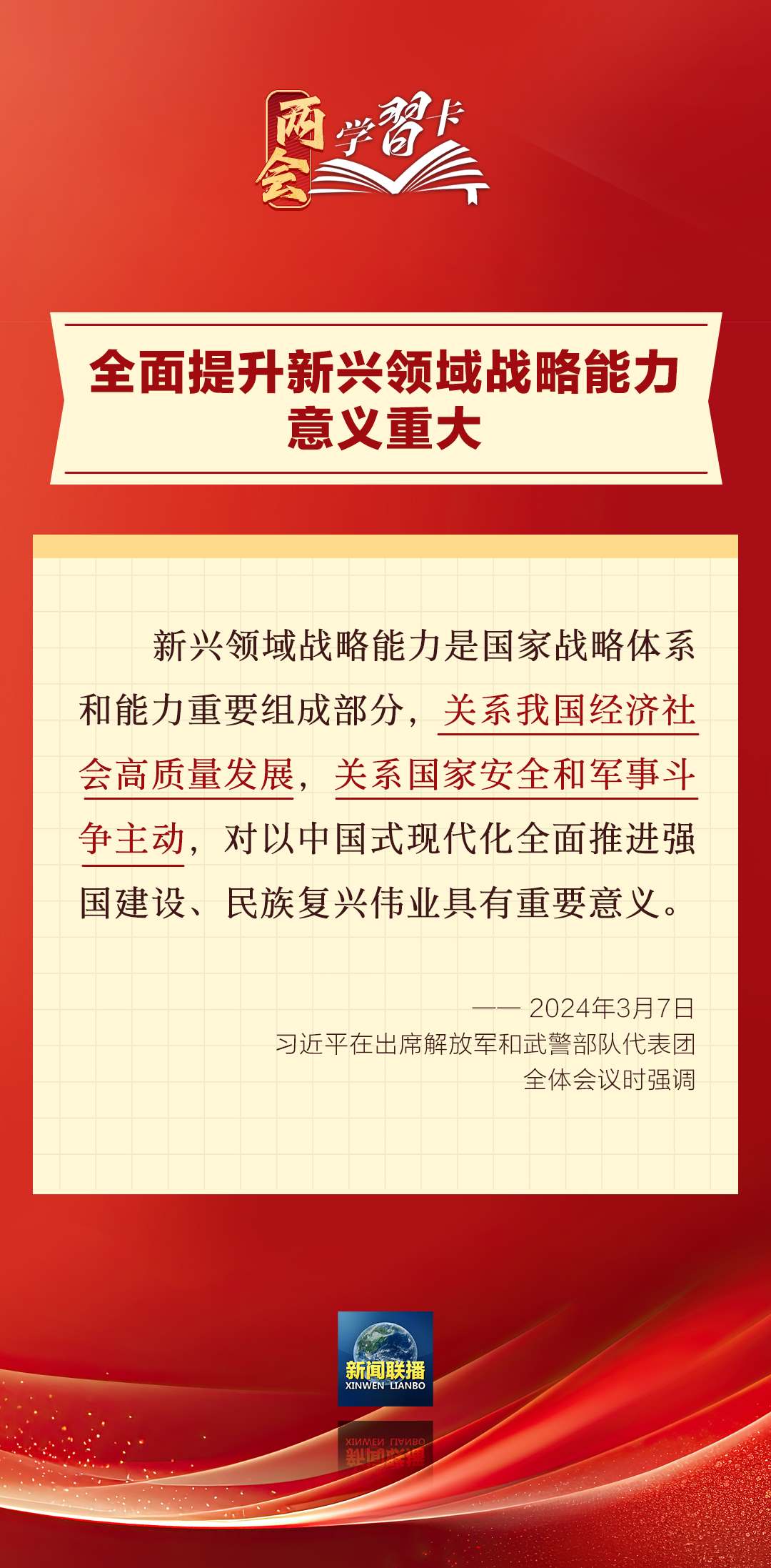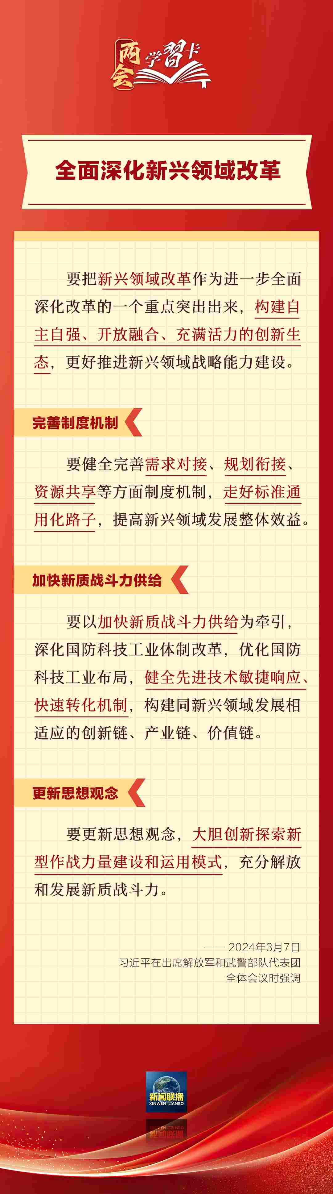 3月7日,習(xí)近平在出席解放軍和武警部隊(duì)代表團(tuán)全體會議時(shí)強(qiáng)調(diào),強(qiáng)化使命擔(dān)當(dāng),深化改革創(chuàng)新,全面提升新興領(lǐng)域戰(zhàn)略能力。如何提升新興領(lǐng)域戰(zhàn)略能力?一起學(xué)習(xí)↓↓↓