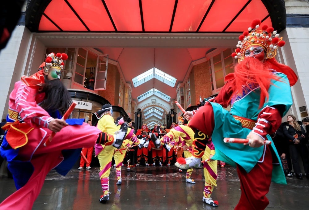 2024年2月10日,來自廣東普寧的英歌舞團(tuán)演員在英國倫敦伯靈頓拱廊街表演英歌舞。新華社記者 李穎 攝
