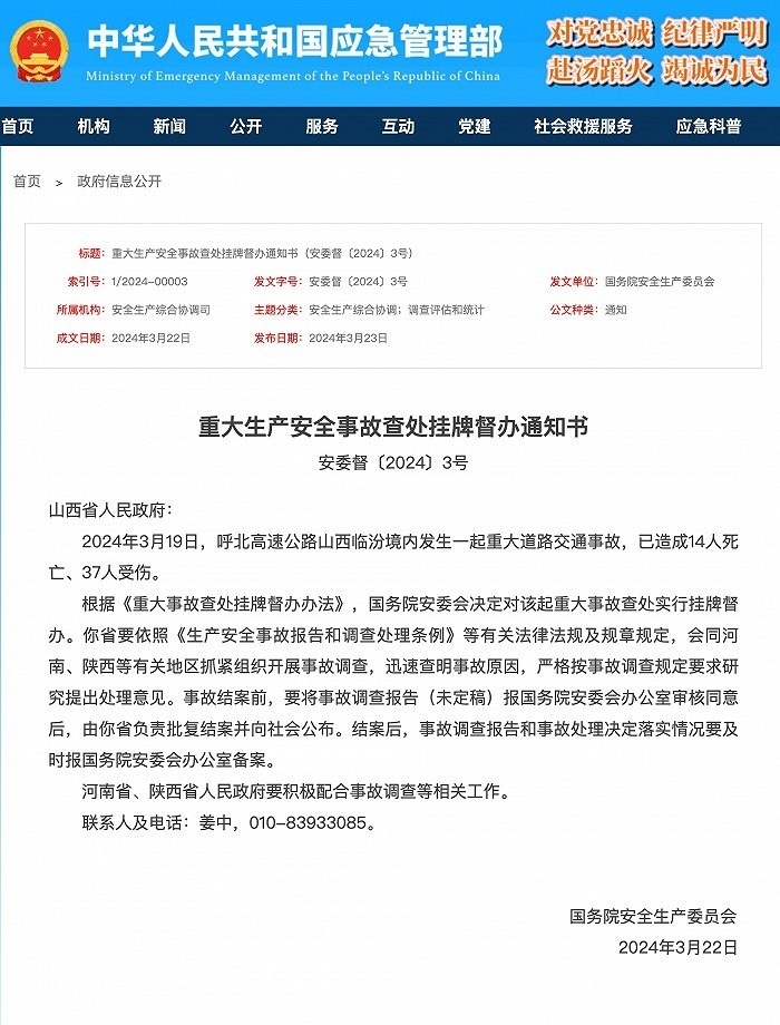 央視網(wǎng)消息:據(jù)應(yīng)急管理部網(wǎng)站消息,國務(wù)院安全生產(chǎn)委員會(huì)3月22日發(fā)布《重大生產(chǎn)安全事故查處掛牌督辦通知書》,2024年3月19日,呼北高速公路山西臨汾境內(nèi)發(fā)生一起重大道路交通事故,已造成14人死亡、37人受傷。根據(jù)《重大事故查處掛牌督辦辦法》,國務(wù)院安委會(huì)決定對該起重大事故查處實(shí)行掛牌督辦。