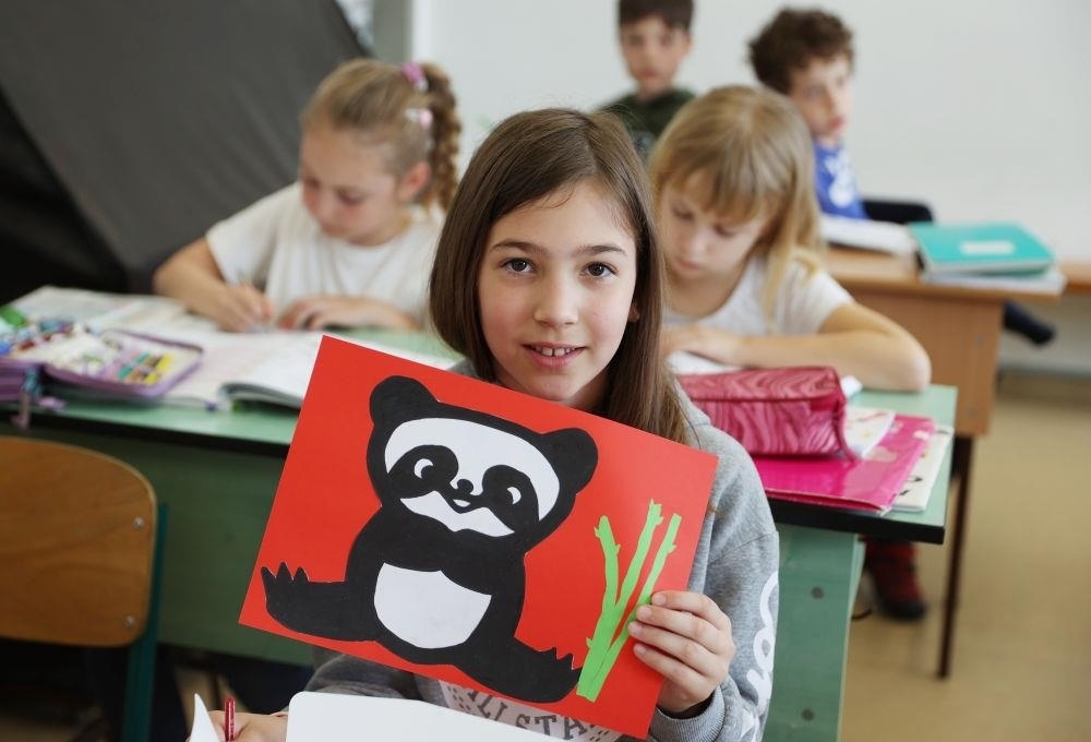 △2024年5月3日,匈中雙語學(xué)校三年級(jí)學(xué)生寶怡展示自己的大熊貓形象美術(shù)作品。