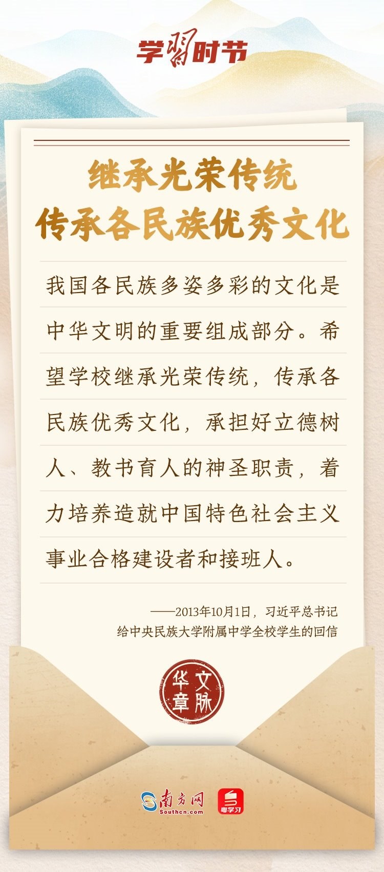“中華民族在幾千年歷史中創(chuàng)造和延續(xù)的中華優(yōu)秀傳統(tǒng)文化,是中華民族的根和魂。”習(xí)近平總書記多次通過發(fā)賀信、寫回信等方式,表達著對弘揚中華優(yōu)秀傳統(tǒng)文化的殷切希望,飽含深情、字字暖心、催人奮進。讓我們一起“讀”信。