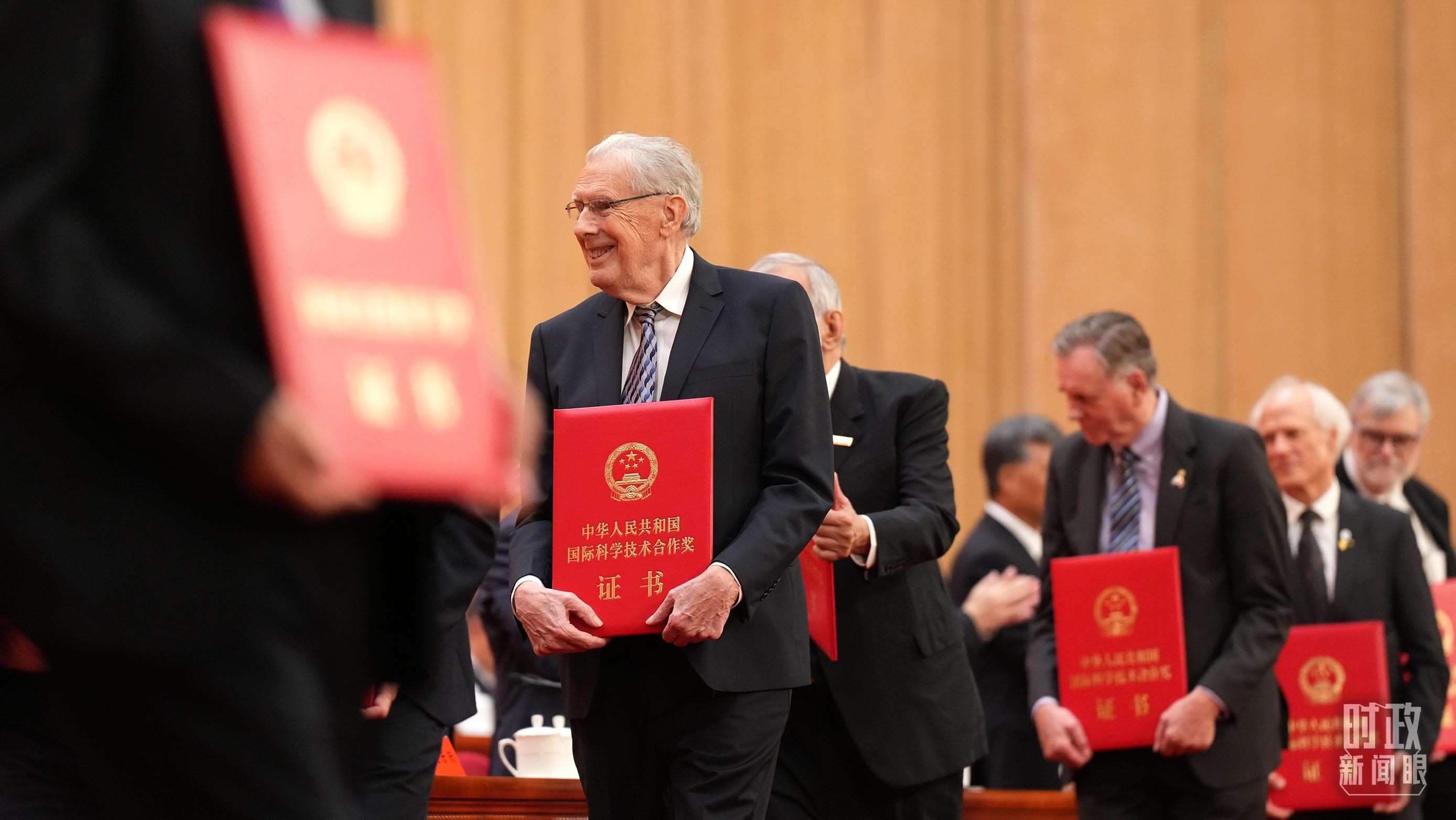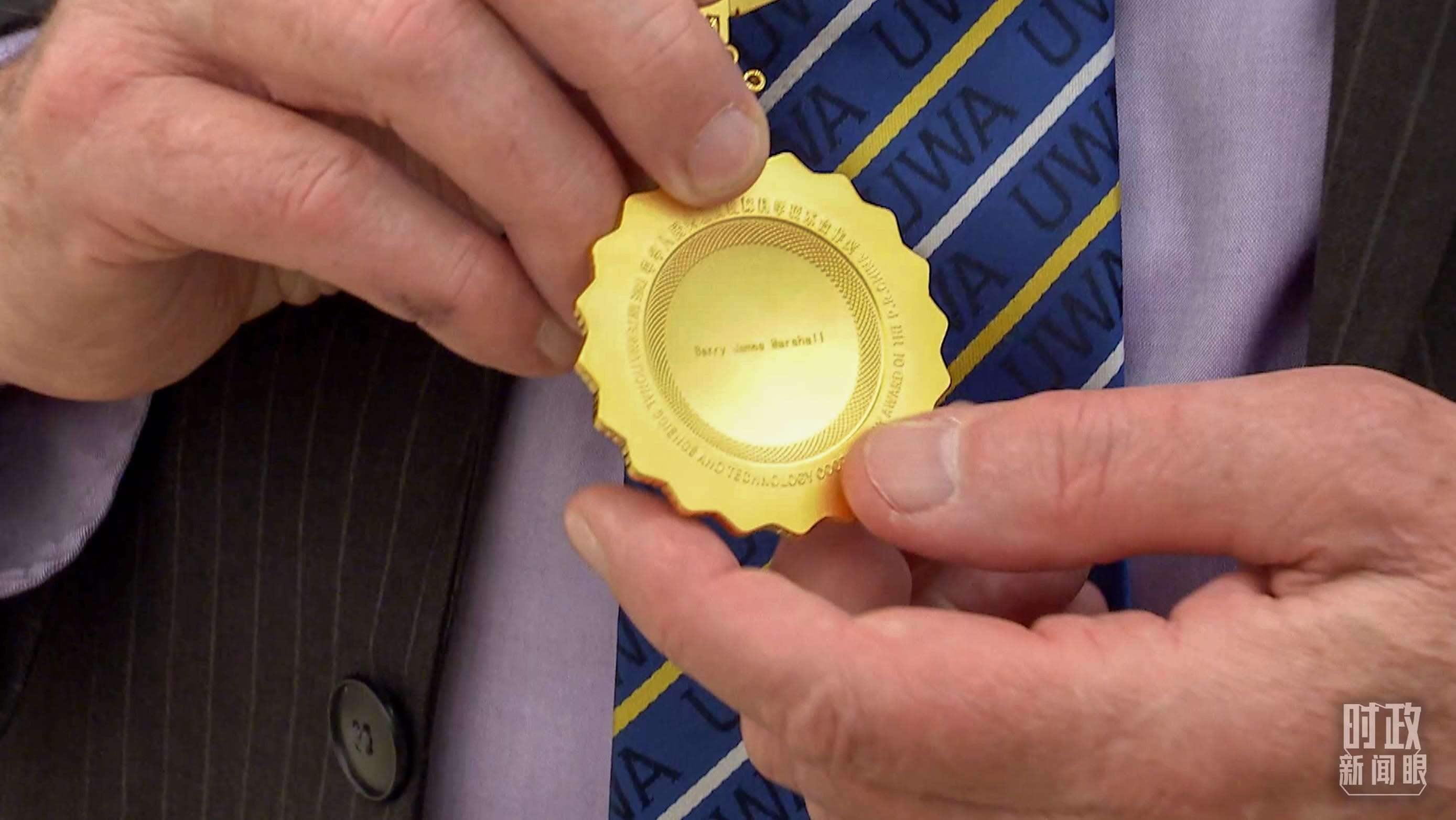 △獲獎的外籍科技工作者,獎章的背面刻有獲獎者姓名。(總臺國廣記者李晉、央視記者姚瑤拍攝)
