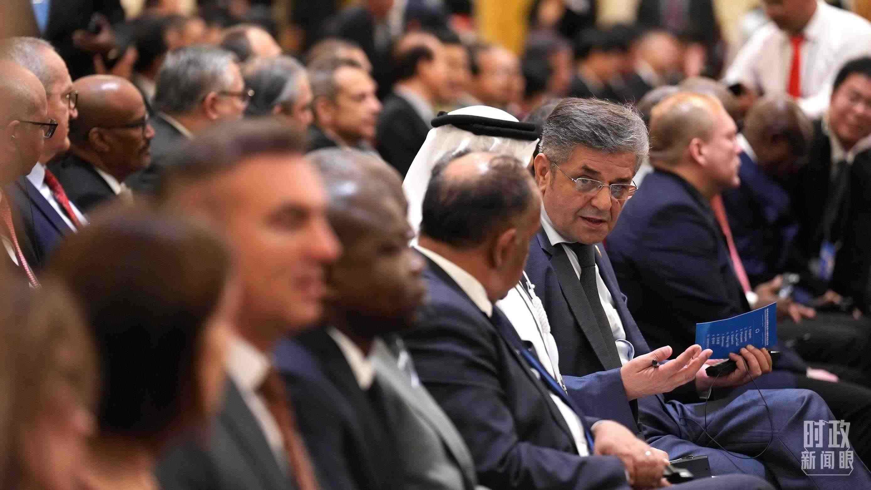 △2023年10月,第三屆“一帶一路”國際合作高峰論壇參會人員駐足了解“一帶一路”標(biāo)志性項目。(總臺國廣記者李晉拍攝)