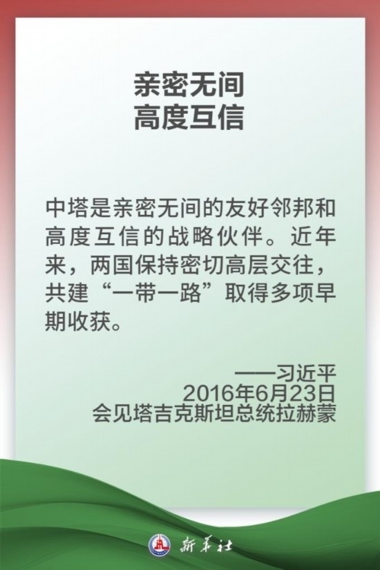 中國和塔吉克斯坦山水相連,兩國人民友好交往源遠流長。中塔建交30年多來,兩國關(guān)系取得跨越式發(fā)展,達到全面戰(zhàn)略伙伴關(guān)系的歷史性高度。塔方最早同中方簽署共建“一帶一路”合作倡議,雙方率先建立發(fā)展共同體和安全共同體。