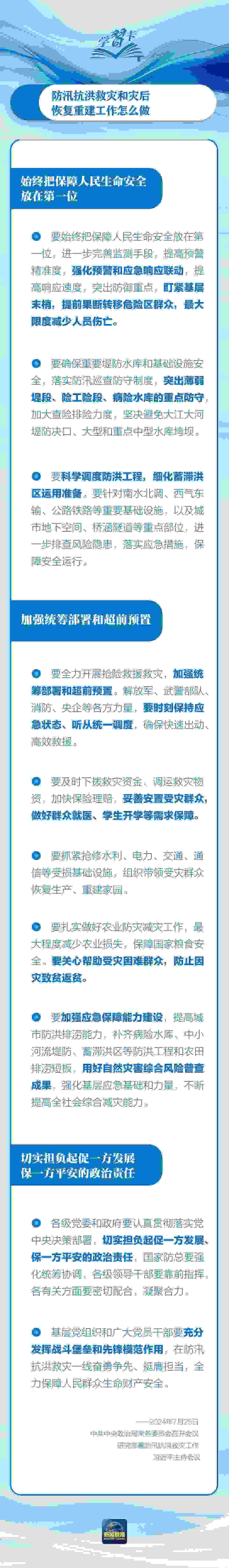 近日,中共中央政治局常委會(huì)召開(kāi)會(huì)議,研究部署防汛抗洪救災(zāi)工作,習(xí)近平主持會(huì)議并發(fā)表重要講話。
