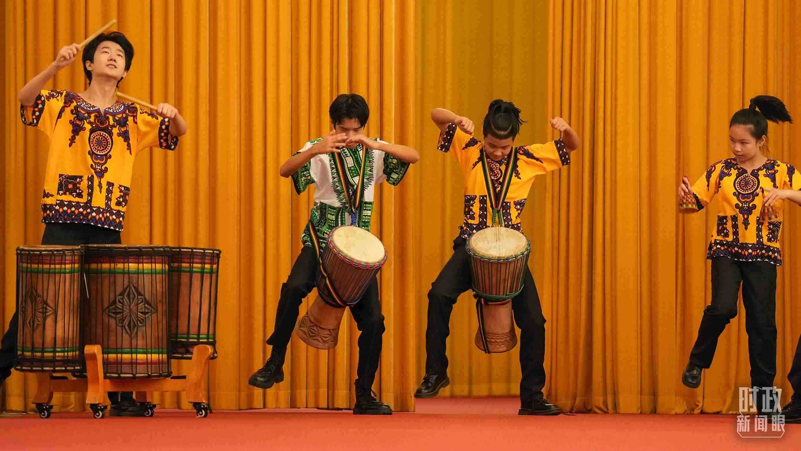△中國(guó)少年打起歡快的非洲鼓。(總臺(tái)記者李晉拍攝)