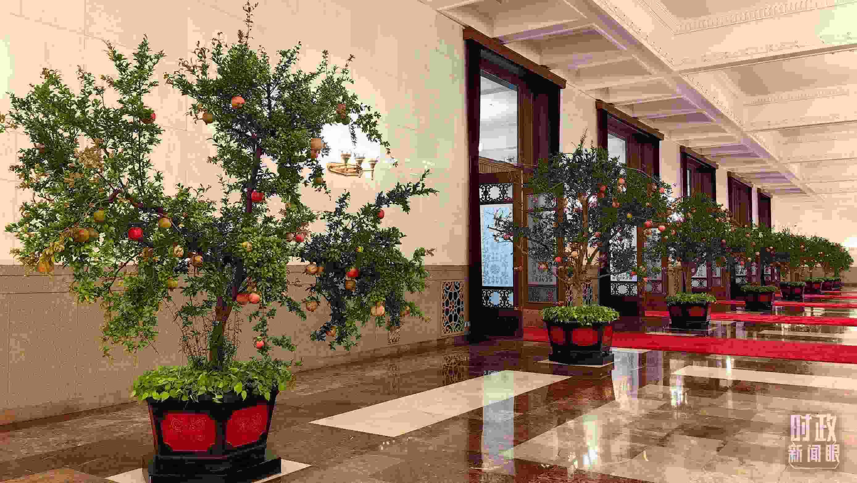 △人民大會(huì)堂碩果累累的石榴盆栽。(總臺(tái)央視記者王曉東拍攝)