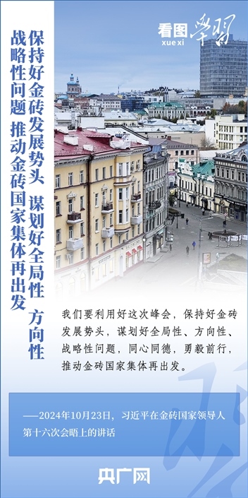 當(dāng)?shù)貢r(shí)間10月23日,國(guó)家主席習(xí)近平在俄羅斯喀山出席金磚國(guó)家領(lǐng)導(dǎo)人第十六次會(huì)晤并發(fā)表重要講話。習(xí)主席深刻闡述推動(dòng)“大金磚合作”高質(zhì)量發(fā)展的中國(guó)主張,就金磚大家庭發(fā)展合作提出五點(diǎn)務(wù)實(shí)舉措,表達(dá)了中方愿同金磚各國(guó)一道,攜手更多“全球南方”國(guó)家共同推動(dòng)構(gòu)建人類命運(yùn)共同體的真誠(chéng)愿望。一起來(lái)學(xué)習(xí)!