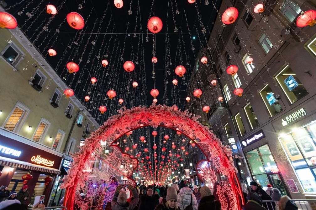 這是2024年2月9日在俄羅斯首都莫斯科拍攝的掛滿(mǎn)中國(guó)新年主題裝飾的街道。新華社記者 白雪騏 攝