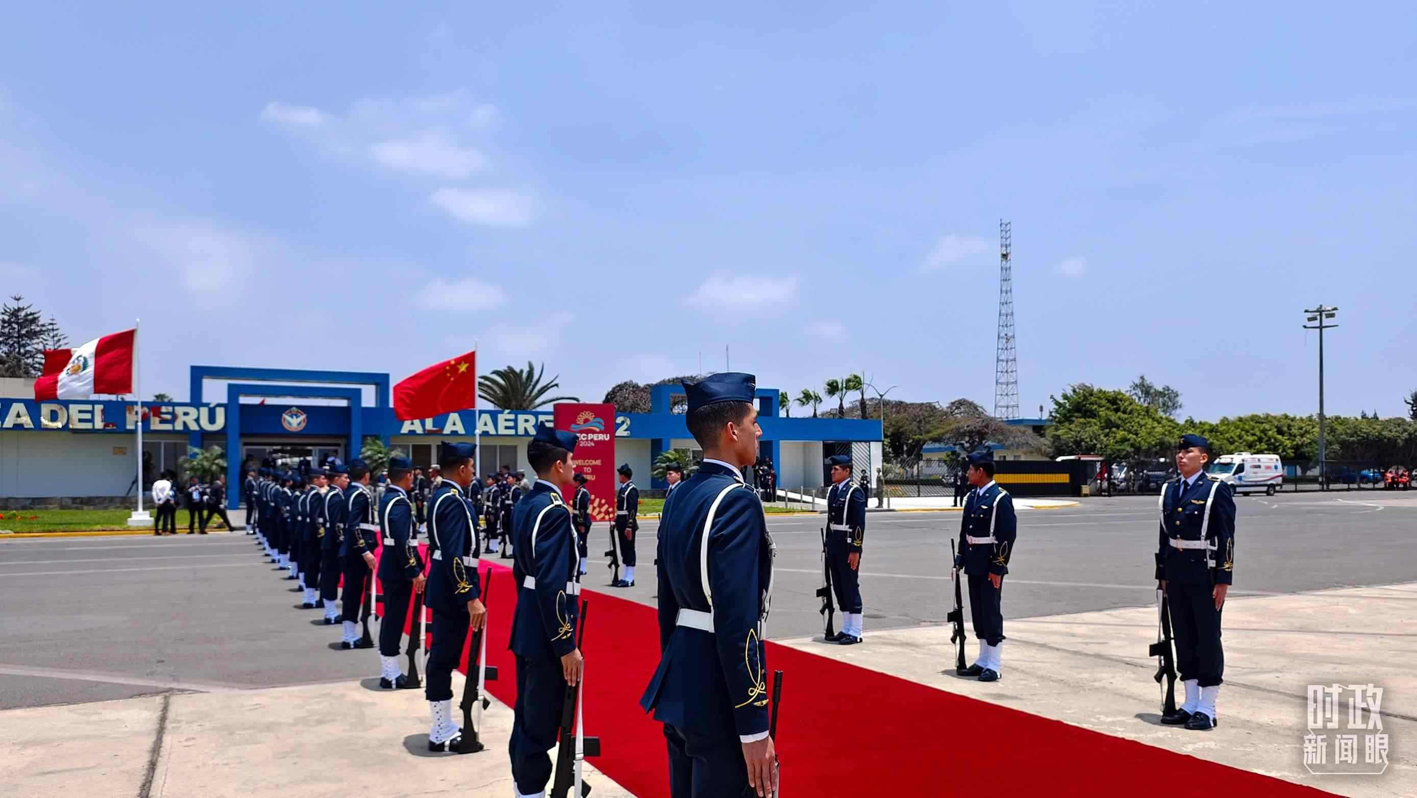 △利馬空軍基地,秘魯禮兵分列紅毯兩側(cè)迎接習(xí)主席到訪。(總臺(tái)央視記者韓銳拍攝)