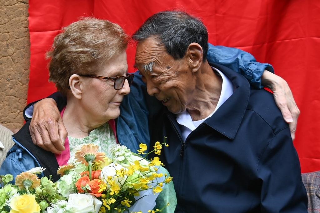 2024年4月17日,在浙江衢州江山市張村鄉(xiāng)龍頭店村,“杜立特行動”3號機(jī)領(lǐng)航員查爾斯·奧祖克的女兒蘇珊·奧祖克(左)與村民廖明發(fā)相擁。1942年,村民廖詩原(廖明發(fā)的父親)一家曾悉心照顧跳傘降落的查爾斯·奧祖克。新華社記者 黃宗治 攝