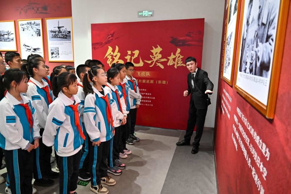 2024年11月30日,烏魯木齊八一中學(xué)的學(xué)生在觀看“銘記英雄——飛虎隊(duì)主題歷史圖片展巡展(新疆)”。新華社記者 丁磊 攝