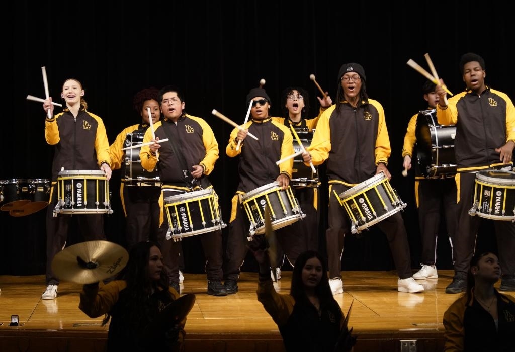 2024年1月30日,在美國華盛頓州林肯中學(xué),學(xué)校鼓樂隊(duì)在美國中學(xué)生赴華交流歡送儀式上表演。新華社記者 吳曉凌 攝
