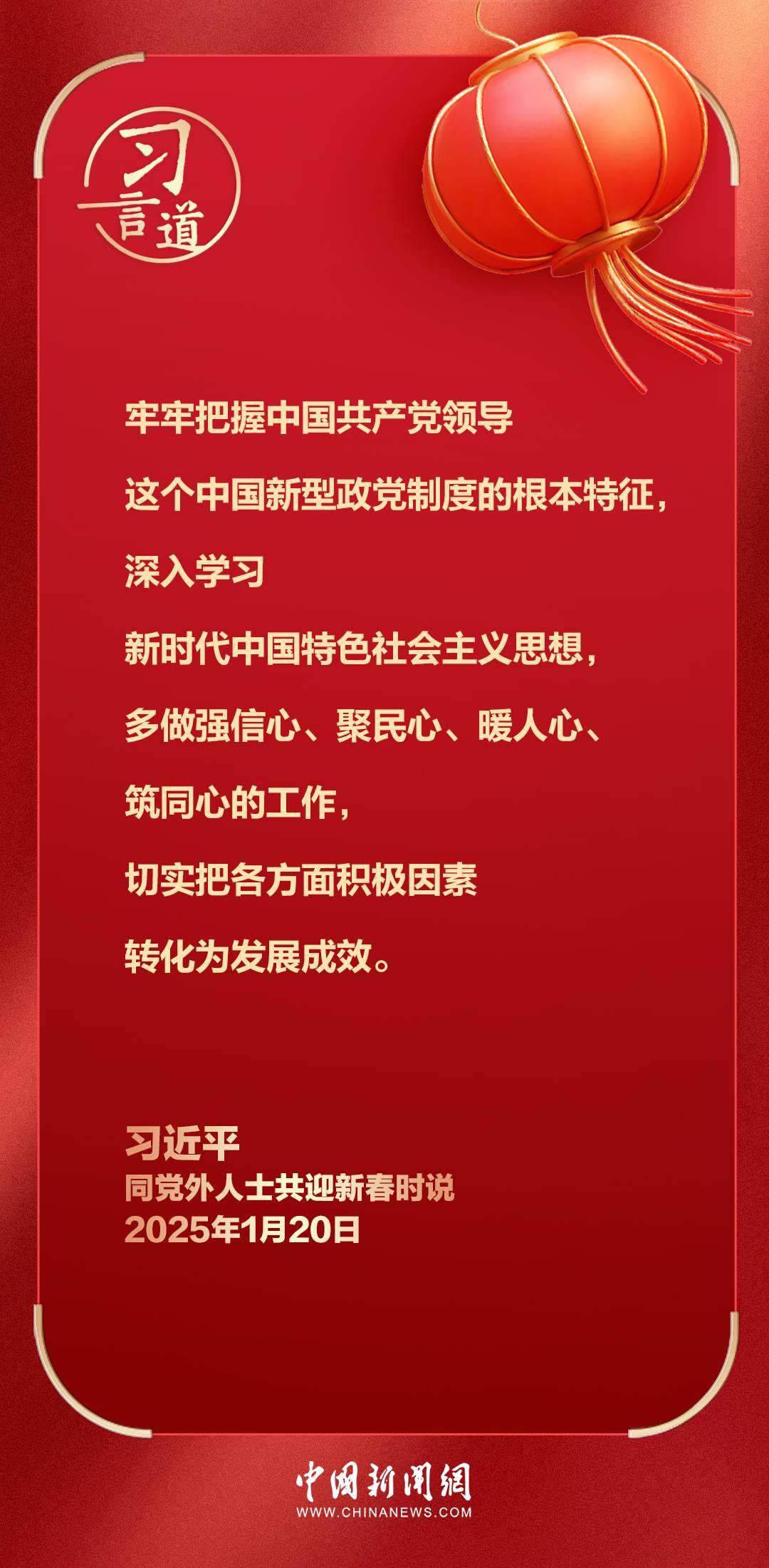 在中華民族傳統(tǒng)節(jié)日乙巳蛇年春節(jié)即將到來(lái)之際,中共中央總書記、國(guó)家主席、中央軍委主席習(xí)近平20日在人民大會(huì)堂同各民主黨派中央、全國(guó)工商聯(lián)負(fù)責(zé)人和無(wú)黨派人士代表歡聚一堂,共迎佳節(jié)。習(xí)近平代表中共中央,向各民主黨派、工商聯(lián)和無(wú)黨派人士,向統(tǒng)一戰(zhàn)線廣大成員,致以誠(chéng)摯問(wèn)候和新春祝福。