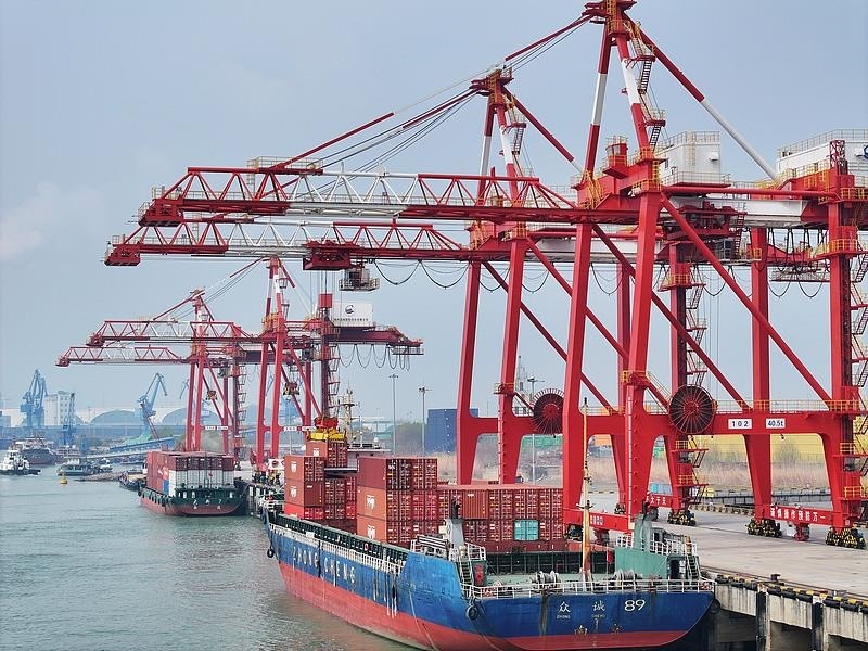 △江蘇揚(yáng)州港,貨輪靠泊在港口裝卸貨物。
