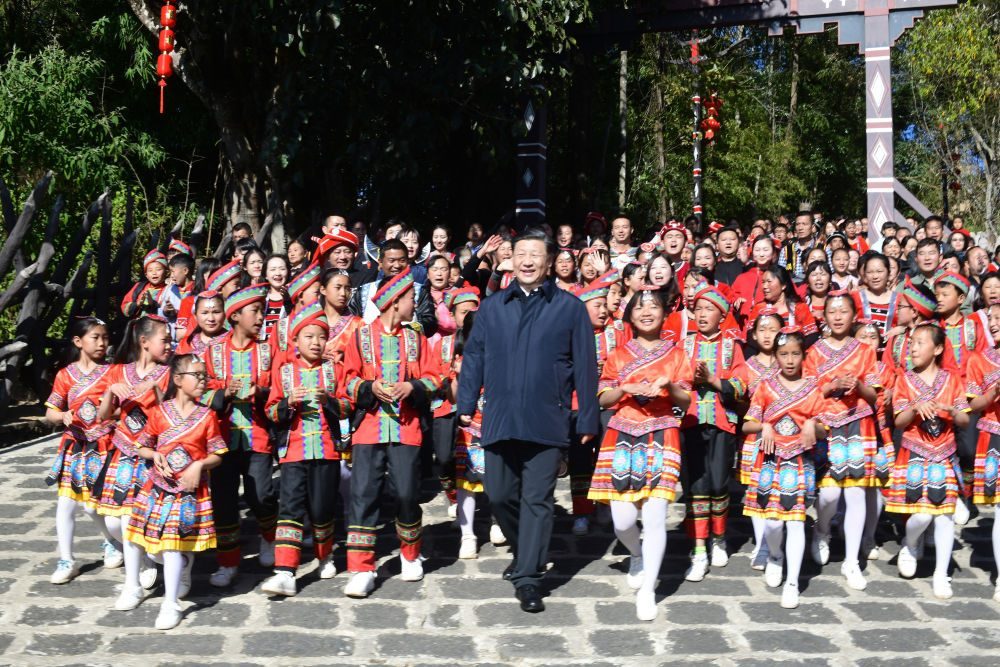2020年1月19日下午,云南省騰沖市清水鄉(xiāng)三家村中寨司莫拉佤族村的鄉(xiāng)親們唱著《阿佤人民唱新歌》,簇?fù)碇?xí)近平走出村口。