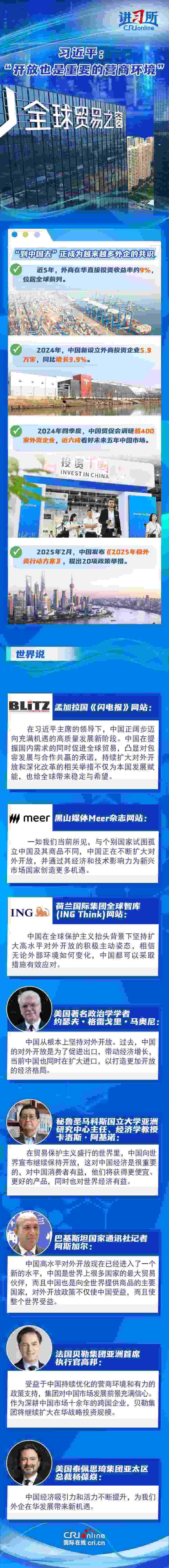 “中國開放的大門不會關(guān)閉,只會越開越大?!比ツ?2月,中國將“擴大高水平對外開放,穩(wěn)外貿(mào)、穩(wěn)外資”列為今年政府重點任務(wù)。新年以來,隨著政策紅利持續(xù)釋放,外資不斷用行動為中國投下“信心票”:德國光電行業(yè)巨頭蔡司宣布將在上海購地自建大中華區(qū)總部園區(qū),意大利百旺集團亞洲總部暨新工廠在蘇州高新區(qū)開業(yè),日本豐田汽車決定在華獨資設(shè)立雷克薩斯純電動汽車及電池的研發(fā)和生產(chǎn)公司……在他們看來,中國持續(xù)優(yōu)化營商環(huán)境、擴大高水平開放,經(jīng)濟吸引力和活力不斷提升,不僅為中國發(fā)展賦能,也給全球帶來穩(wěn)定與希望。
