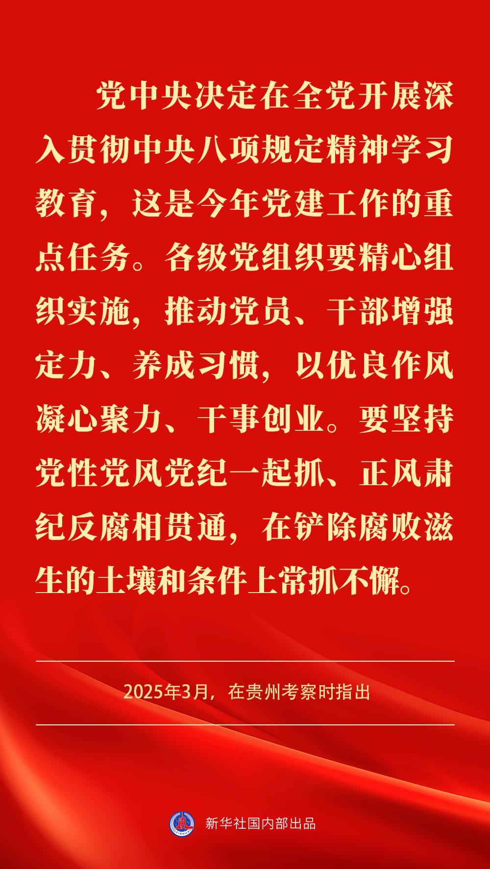 中央黨的建設(shè)工作領(lǐng)導(dǎo)小組近日召開會(huì)議指出,黨中央決定,自2025年全國兩會(huì)后至7月在全黨開展深入貫徹中央八項(xiàng)規(guī)定精神學(xué)習(xí)教育。