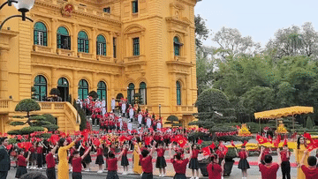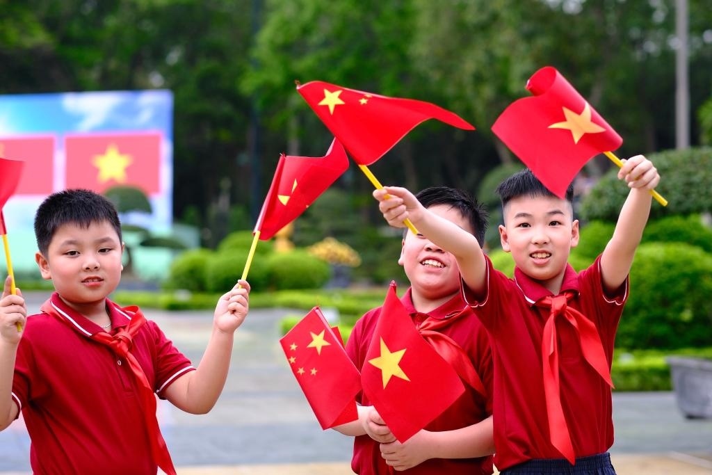 主席府廣場上,五星紅旗同金星紅旗迎風(fēng)飄揚(yáng),200多名越南少年兒童揮舞旗幟,熱烈歡迎習(xí)近平到訪。