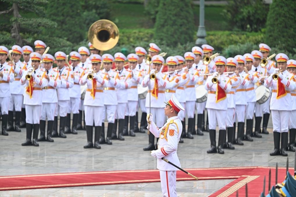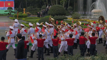 軍樂團(tuán)奏中越兩國國歌,鳴禮炮21響。
