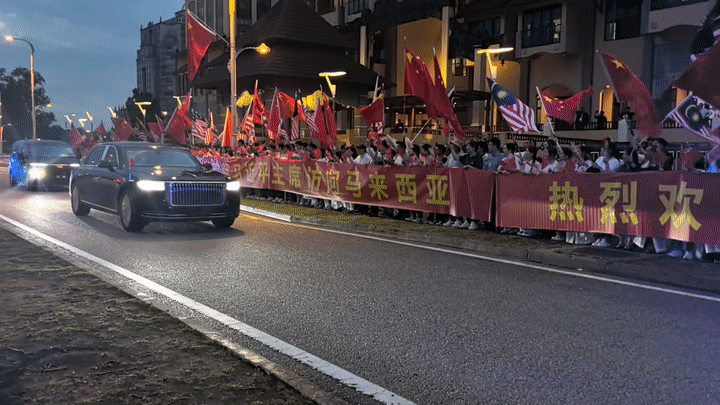 習近平乘車從機場赴下榻飯店途中,當?shù)刂匈Y企業(yè)人員、留學生在道路兩旁揮舞中馬兩國國旗,高舉“熱烈歡迎習近平主席訪問馬來西亞”、“中馬友誼萬歲”等紅色橫幅,華僑華人表演喜慶熱烈的舞獅,歡迎習近平到訪。