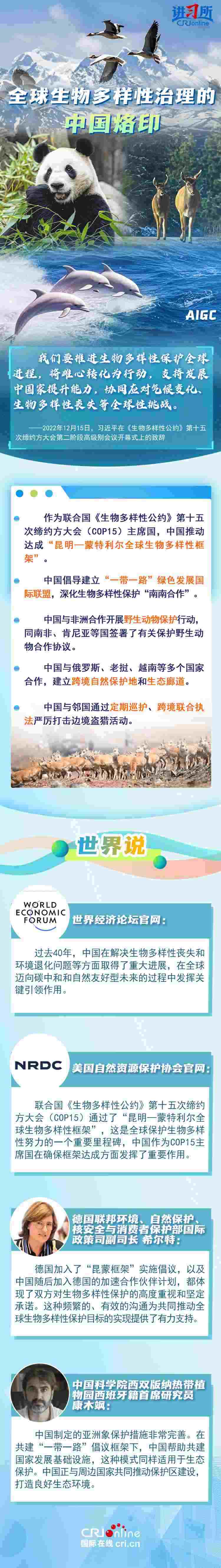 “心往一處想、勁往一處使,共建地球生命共同體。”作為最早簽署、批準(zhǔn)《生物多樣性公約》的締約方之一,生物多樣性保護(hù)已經(jīng)上升為中國(guó)的國(guó)家發(fā)展戰(zhàn)略。國(guó)際人士表示,中國(guó)的一系列舉措體現(xiàn)出對(duì)生態(tài)環(huán)境保護(hù)的堅(jiān)定決心,同時(shí),中國(guó)依托共建“一帶一路”倡議等國(guó)際合作機(jī)制,為推動(dòng)全球生物多樣性保護(hù)提供了有力支持,在邁向自然友好型未來的過程中發(fā)揮關(guān)鍵的引領(lǐng)作用。