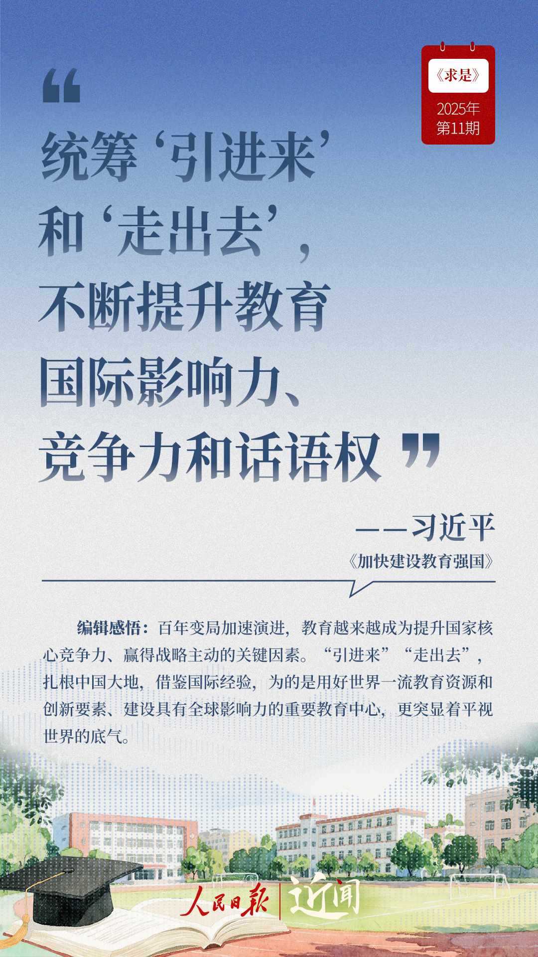 教育是國之大計(jì)、黨之大計(jì)。日前,《求是》雜志發(fā)表習(xí)近平總書記重要文章《加快建設(shè)教育強(qiáng)國》?!叭姘盐战逃恼螌傩浴⑷嗣駥傩?、戰(zhàn)略屬性”“讓教育改革發(fā)展成果更多更公平惠及全體人民”“讓教師享有崇高社會聲望、成為最受社會尊重的職業(yè)之一”……通過這些話,一起感悟習(xí)近平總書記對教育強(qiáng)國建設(shè)的謀劃與部署。