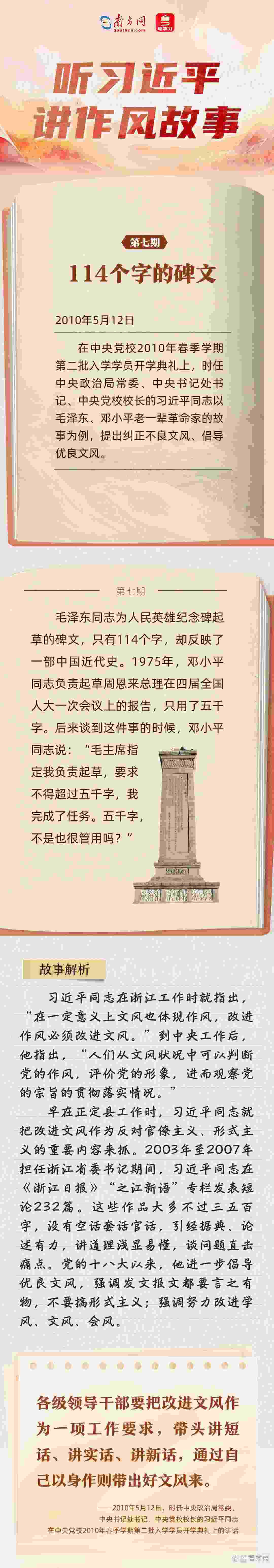 當(dāng)前,全黨上下正在開(kāi)展深入貫徹中央八項(xiàng)規(guī)定精神學(xué)習(xí)教育,縱深推進(jìn)作風(fēng)建設(shè)。關(guān)于作風(fēng)建設(shè),習(xí)近平總書(shū)記常用講故事的方式,傳達(dá)深意、感染他人,給人以思想啟迪。南方網(wǎng)、粵學(xué)習(xí)客戶端推出“聽(tīng)習(xí)近平講作風(fēng)故事”系列報(bào)道,與您一起感悟這些故事蘊(yùn)含的深刻道理。 今天,推出《聽(tīng)習(xí)近平講作風(fēng)故事⑦丨114個(gè)字的碑文》,與您一起學(xué)習(xí)毛澤東、鄧小平老一輩革命家的文風(fēng)。